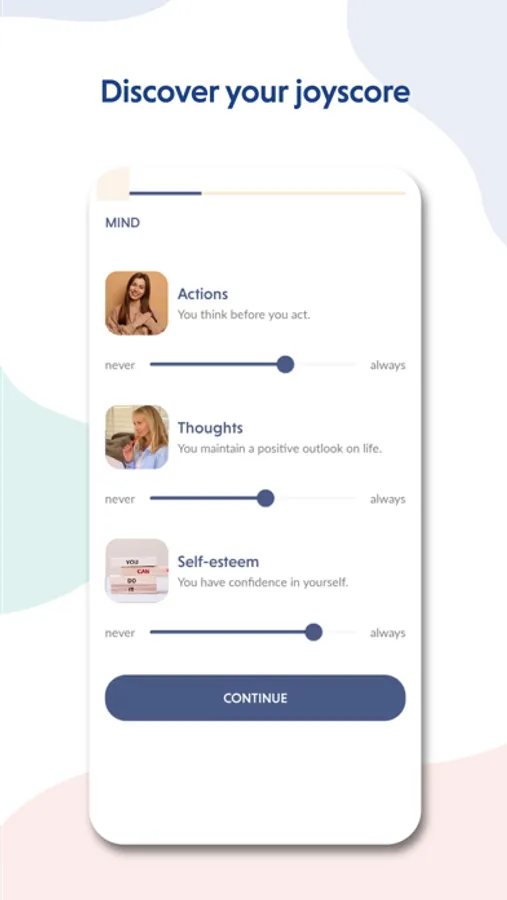 Discover what it means to experience true joy and prioritize self-care. JoyScore allows you to tune out anxiety and negative self-talk and focus on creating the life you want. The JoyScore app is here to help you track your progress and keep you motivated on your health and happiness journey. Get the motivation you need to take charge of your life through fun, simple, powerful habits designed for you.