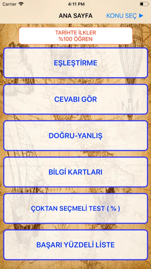 Tarihte ilkler hakkında bugüne kadar hiçbir bilginiz yoksa, Başarı Yüzdeli Liste bölümünden tüm bilgilere ulaşabilirsiniz. Bu bölümü arada sırada okuyabilirsiniz. Bu okuma size bir aşinalık kazandıracaktır; ama %100 öğrenmeyi bu şekilde sağlamanız çok zor! Uygulamamızdaki diğer bölümleri kullanarak bilgileri kalıcı hale getirebilirsiniz.