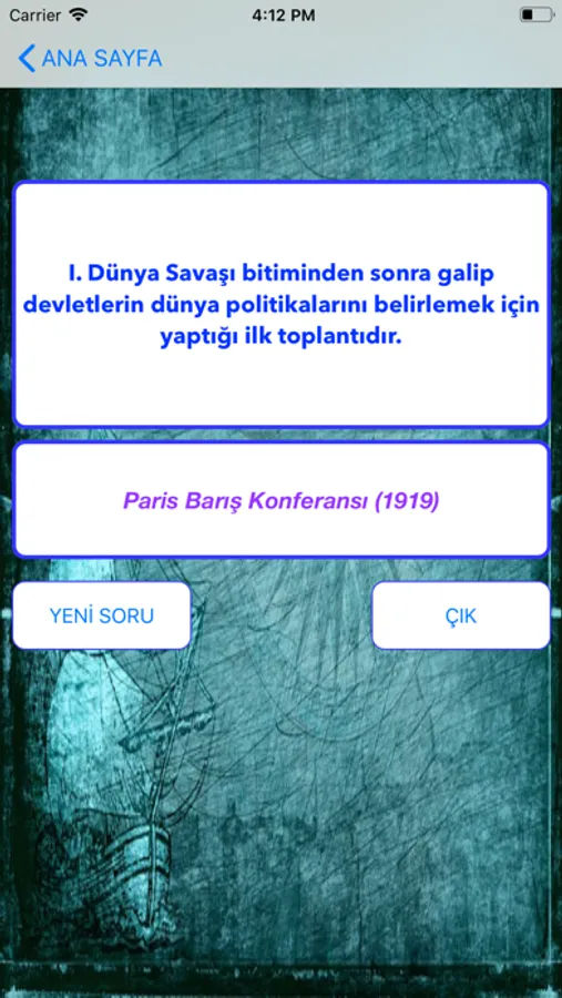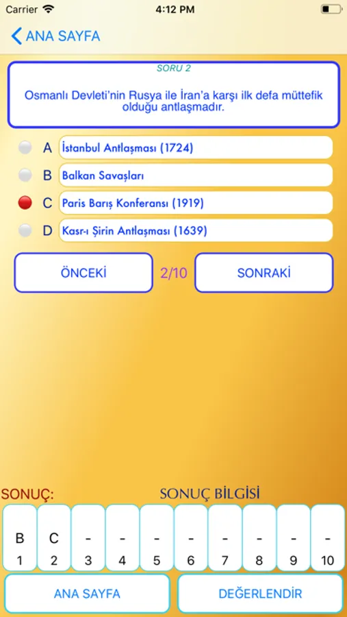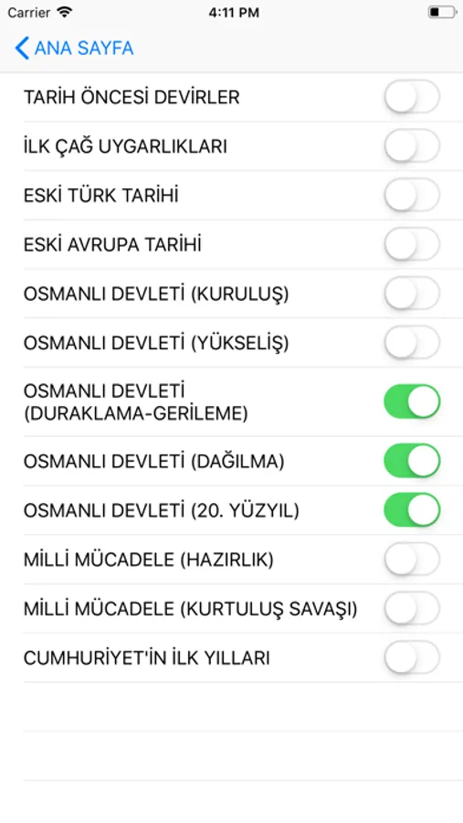 Uygulamamızda tüm bu bölümler ayrı ayrı tasniflenmiştir. Uygulamamızı kullanırken dilediğiniz bölüm veya bölümleri seçebilirsiniz. Bu sayede sadece çalışmak istediğiniz dönemlere ait bilgiler karşınıza çıkar. Dilediğiniz zaman bölümlerde değişiklik yapabilirsiniz. (Bilgi ve şıklar, seçtiğiniz konular arasından rastgele geleceği için birden fazla dönem seçmeniz durumunda birbiriyle ilgili dönemleri seçmenizi öneriyoruz.)