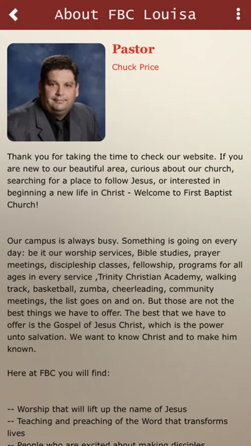 This app is provided to serve as a technology hub for information and service provided by the First Baptist Church of Louisa, KY. We hope the congregation/community take the time to review our app and what it has to offer them in their spiritual walk with Jesus.