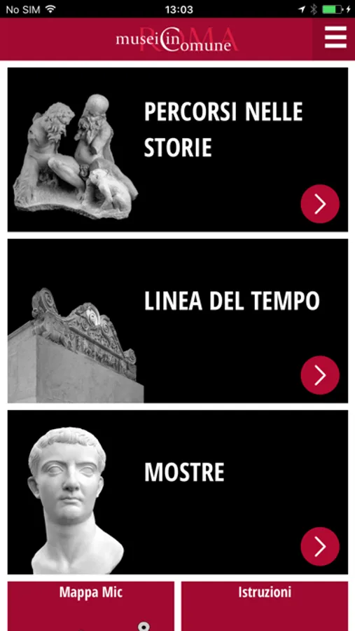 L’applicazione, disponibile in cinque lingue (italiano, english, français, deutsch, español) presenta tre macro-sezioni: Percorsi nelle storie, attraverso cui è possibile accedere a percorsi tematici con durata predeterminata, Linea del tempo, con macro-linea del tempo in cui sono inserite le opere del museo e i principali eventi storici correlati, e Mostre, con descrizione dettagliata delle mostre presenti nel circuito dei Musei in Comune.