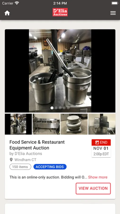 Welcome to the D'Elia Auctions mobile bidding app! This dynamic app allows you to (1) stay informed about our upcoming auctions; (2) view items that interest you; (3) get notifications when you’ve been outbid; (4) bid no matter where you are located (or set and forget your maximum bid to let our platform automatically bid the lowest possible winning bid for you). This is the go-to-source for up-to-the-minute information on all of our auctions.