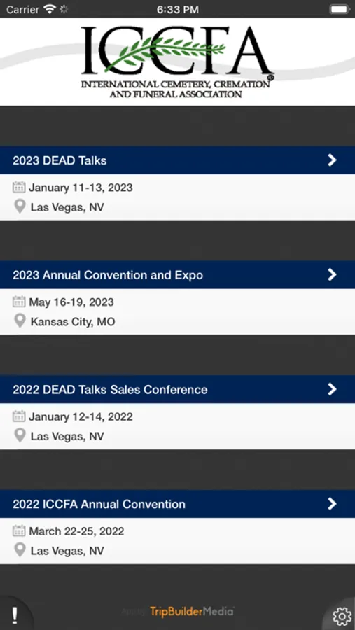 TripBuilder Multi Event Mobile™ is the official mobile application for the International Cemetery, Cremation and Funeral Association (ICCFA) Events.