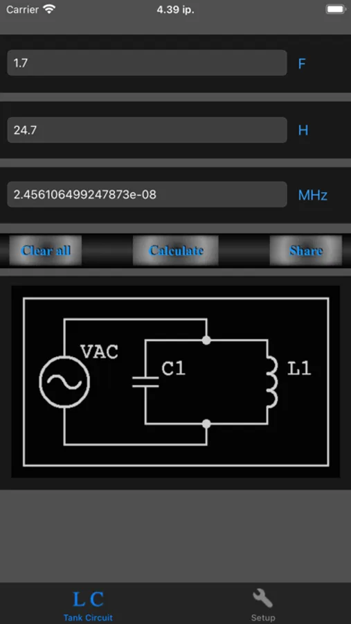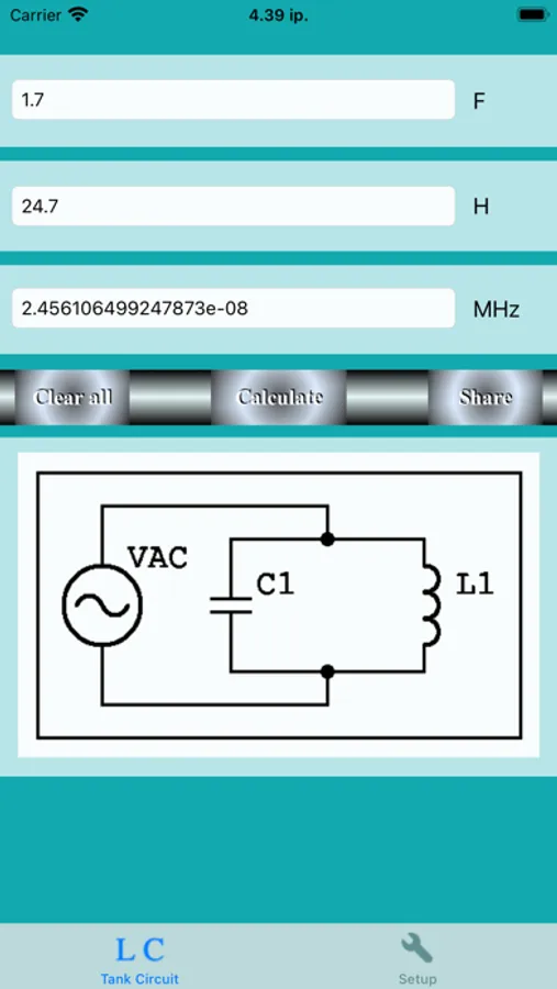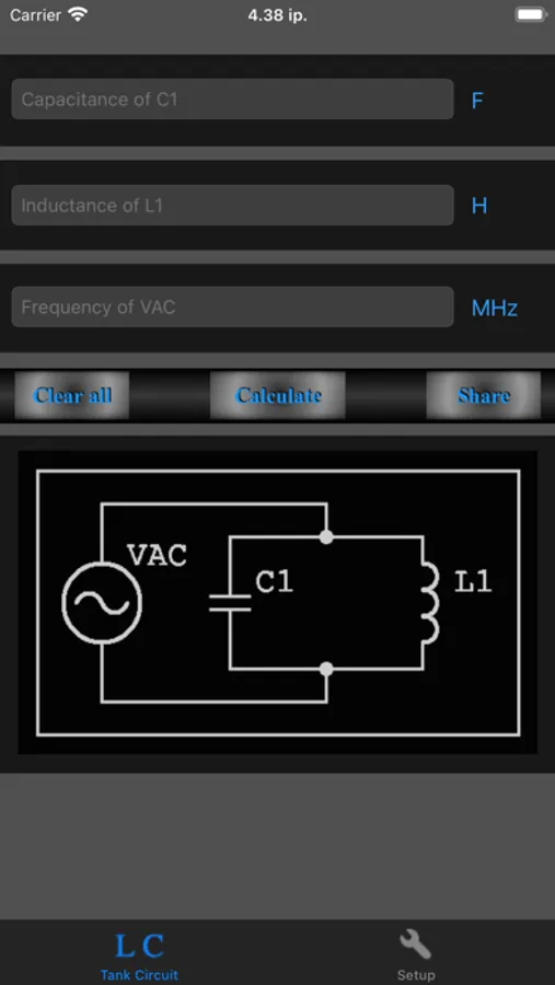 With this app you can calculate one of the three values of your LC-tank-circuit. You only need to put two values and tap calculate-button and the app will calculate the third value.