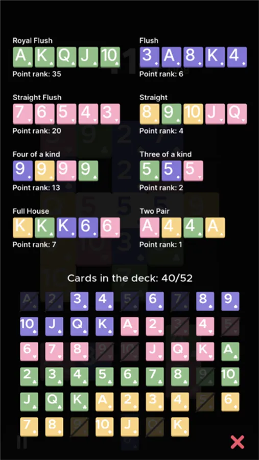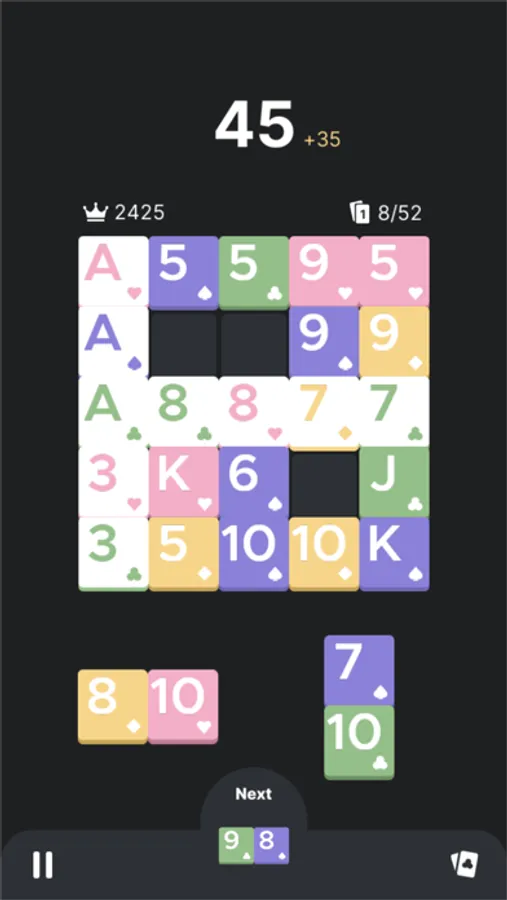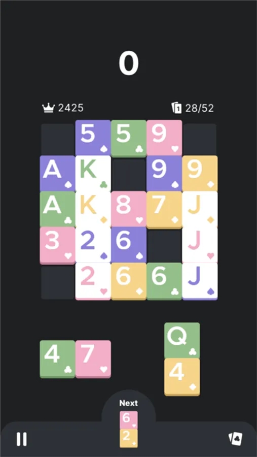 Poker Pop is a domino style tile matching game where you place cards onto the board to create poker hands. Score as many points as you can before filling up the board.