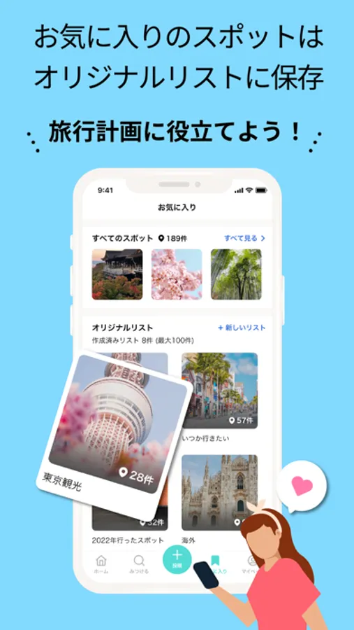 ・行きたい旅行先をワンタップで保存して、オリジナルリストで整理。計画に役立てよう。