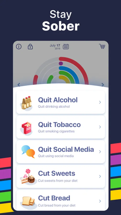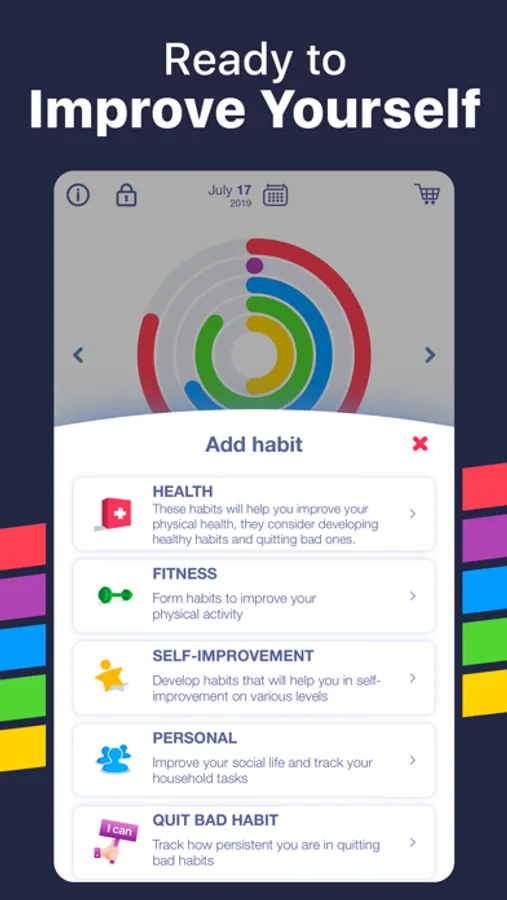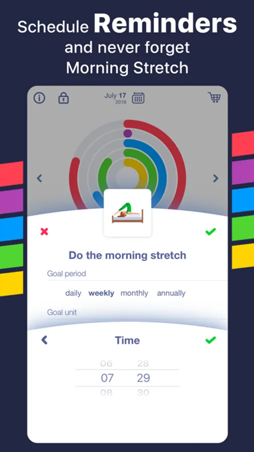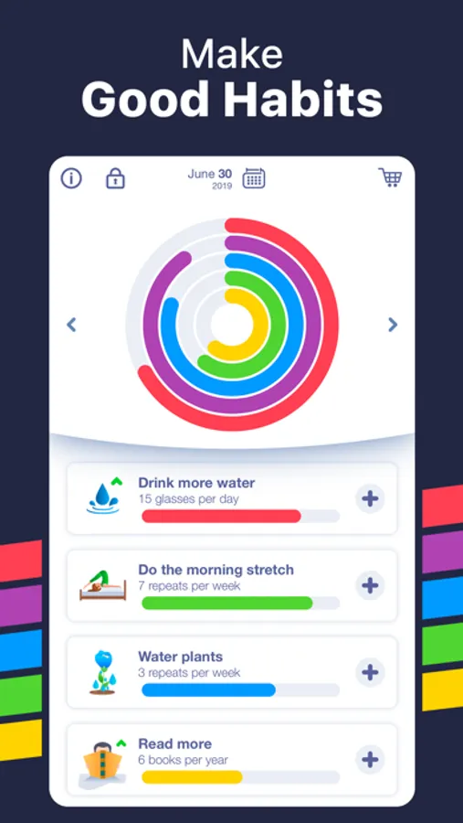 You can use it to create healthy habits or get rid of the unhealthy ones, all the time monitoring your activities and help you stay focused on your goals. The goals are represented by rings or streaks which fill up as you meet your goals. Different colors are used for different habit groups and are vividly displayed.