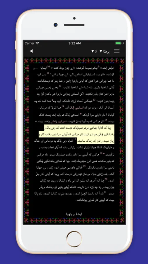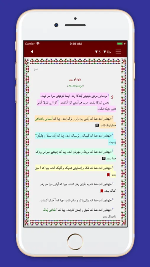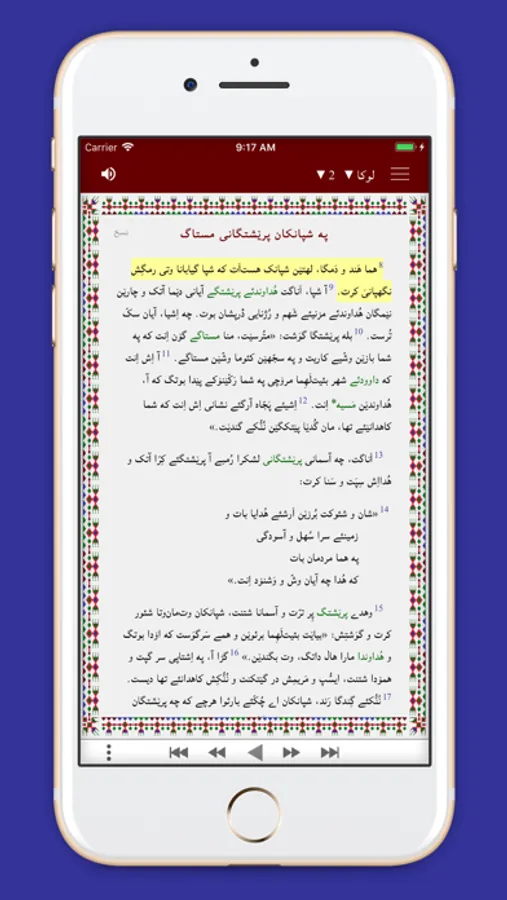 بلوچی زبان میں کلامِ مقدس سے منتخب متن اور صوتی ریکارڈنگ بشمول چاروں اناجیل (متی، مرقس، لوقا اور یوحنا) جو یسوح مسیح کی زندگی، معجزات، موت اور جی اٹھنے کی وضاحت کرتی ہیں۔ رسولوں کے اعمال ، کلیسیا کی نشوونما، خدا کی انسان سے محبت کے پیغام اور کیسے انہوں نے یسوح مسیح کو ہمیں نجات دینے کیلئے بھیجا ، کی وضاحت کرتے ہیں۔یہ پیغام یروشلم سے ہوکر ساری رومی سلطنت میں پھیل گیا۔ یہ وہ وقت تھا جب پہلی مرتبہ مسیح کے پیروکار کرسچیئن پکارے جانے لگے تھے۔ اس اپلیکیشن پر یسوح مسیح اور ان کے حواریوں کے متعلق بلوچی زبان میں فلم بھی دستیاب ہے۔