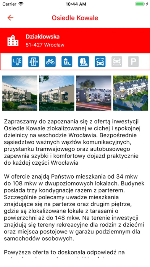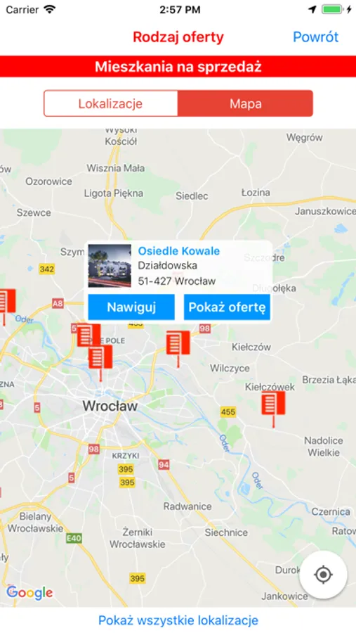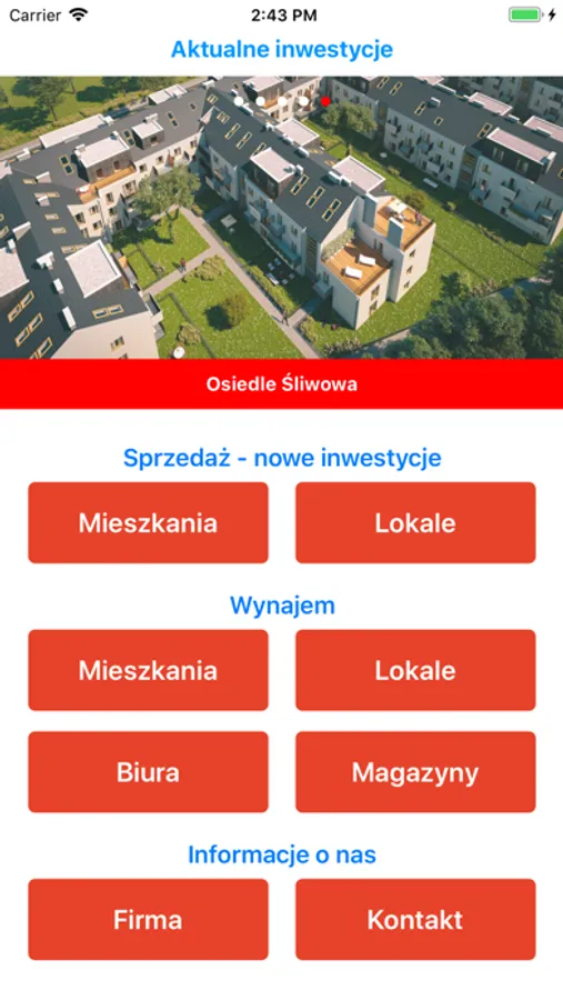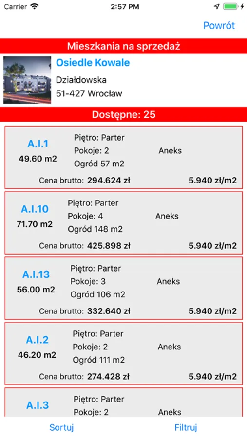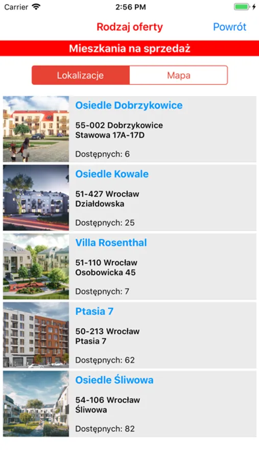 Aplikacja wyświetla dostępne inwestycje Deweloper INTER-ES oraz innych podmiotów.