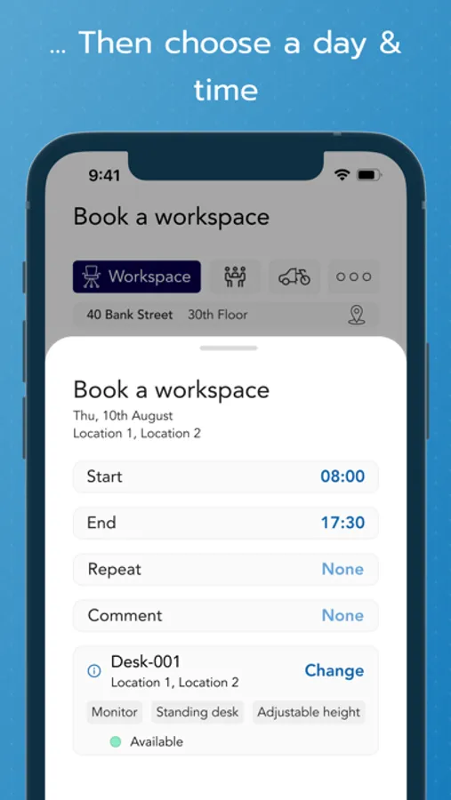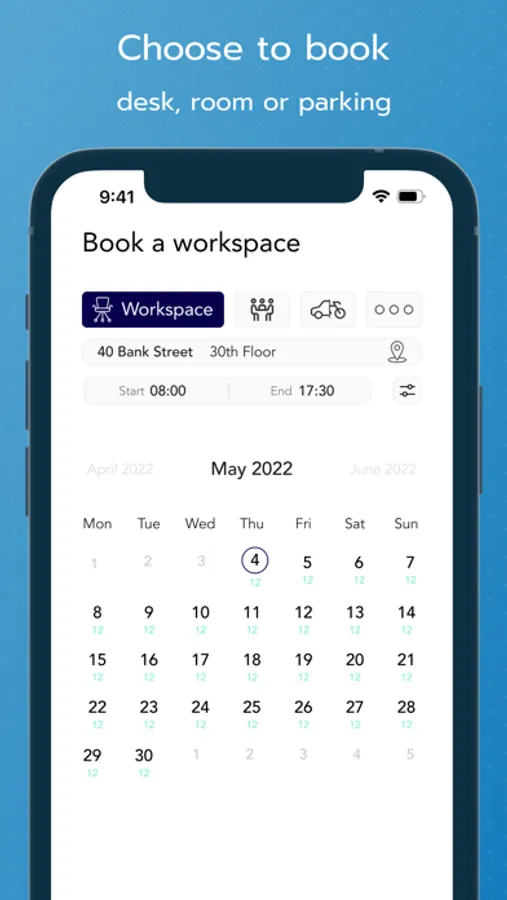 PERFECT FOR PARKING. Whether commuting by bike or car, book a parking spot for the day or in advance. Make changes with ease so you arrive to work confident – managed with full access permissions and work calendar integration.