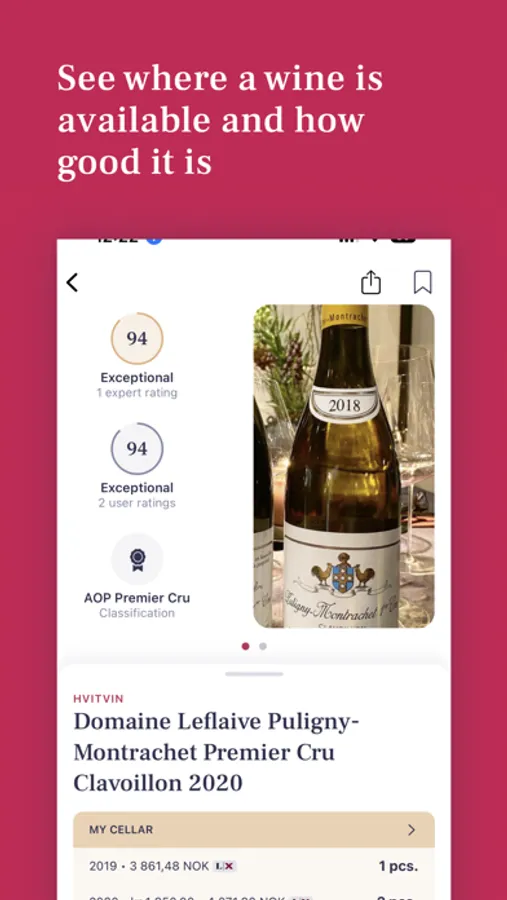 Keep track of your wine cellar. Save quantity, location, personal notes, price and see the experts' ratings.