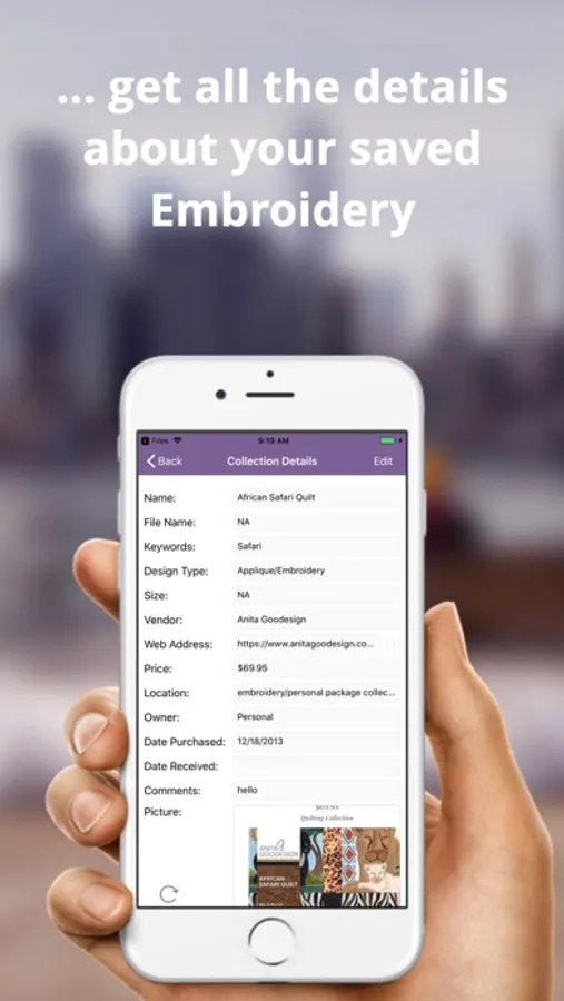 Imagine this, someone asks if you can embroider a dinosaur on a baby bib. Of course you said sure. Now you have the task of where do I purchase the embroidery design or I think I may have one. Trying to remember if you have a design or not was a problem and having to look through your computer or notebook takes a long time. For us crafters our time is precious. This app will alleviate the problem. Plus, you won't purchase the same design twice, which you know you've done in the past. With this app you can do a search for a specific design; like the dinosaur and all those designs will appear on your screen. You can open it and see a picture of how it looks. It's in your hands; you will add the data and the way you want to locate your designs