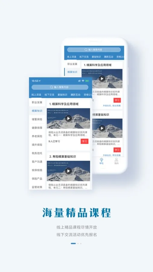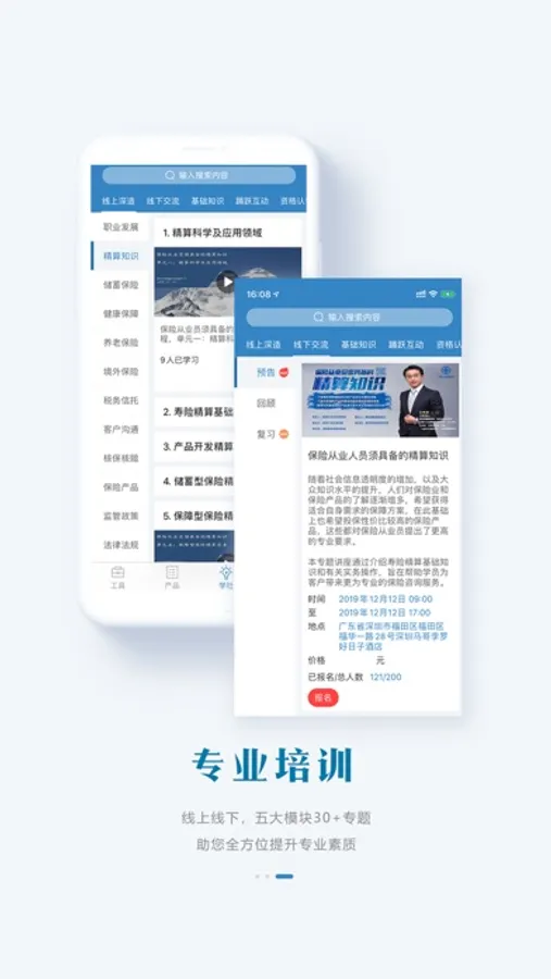覆盖线上和线下,包括5大模块,30余项专题,助力APP会员全方位提升专业素质,在同业竞争中胜出。