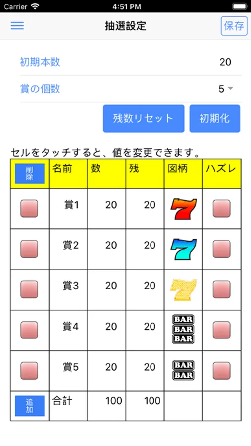 - 各賞ごとの本数、ハズレの判定を設定できます。賞は最大10種類
