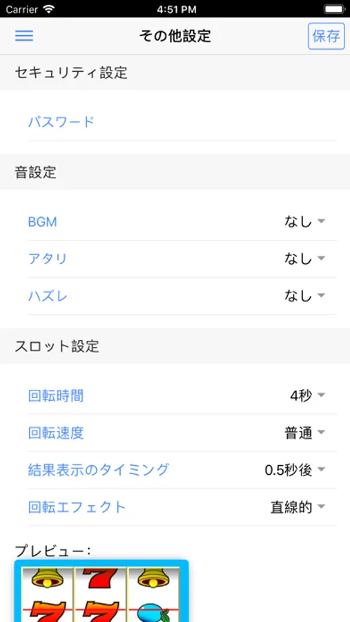 - スロットの回転時間や速度、エフェクトなどを設定できます。