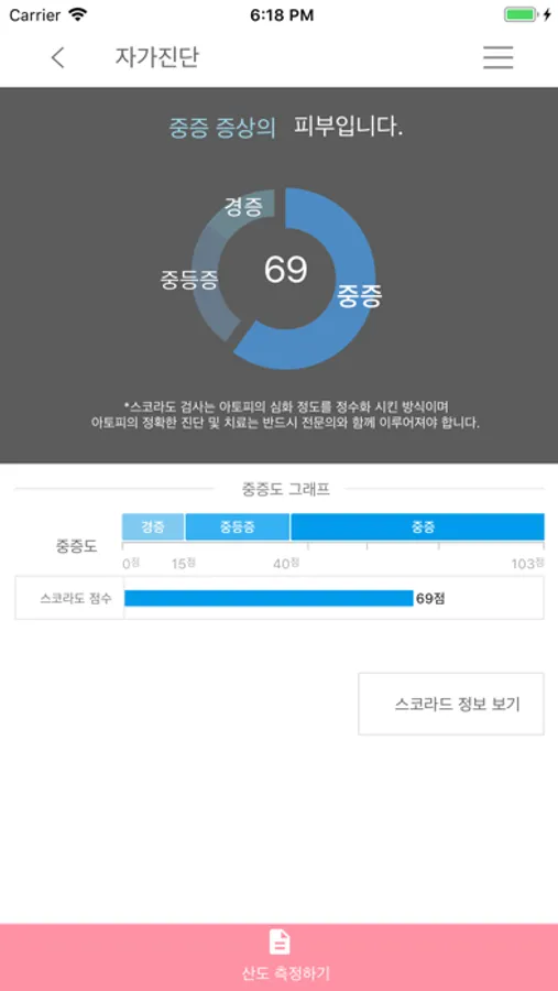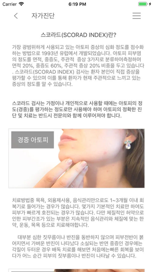 아토피 검사 중 광범위하게 사용되고 있는 아토피 증상의 심화 정도를 점수화하는 방법으로