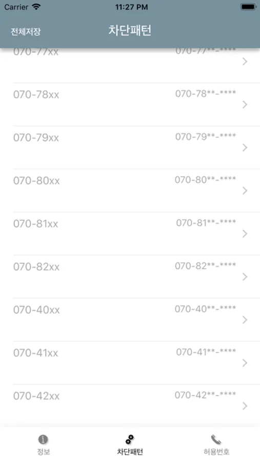 한국에서 사용되는 인터넷 전화 국번 23개에 대한 차단 패턴이 정의되어 있으므로 원하는 국번을 선택하여 스위치를 켜면 해당 국번에 속하는 모든 전화번호가 차단됩니다.
