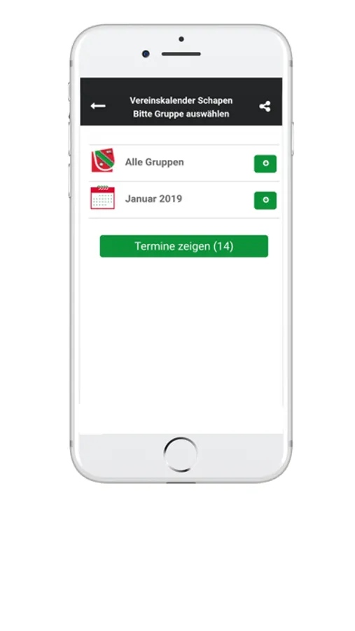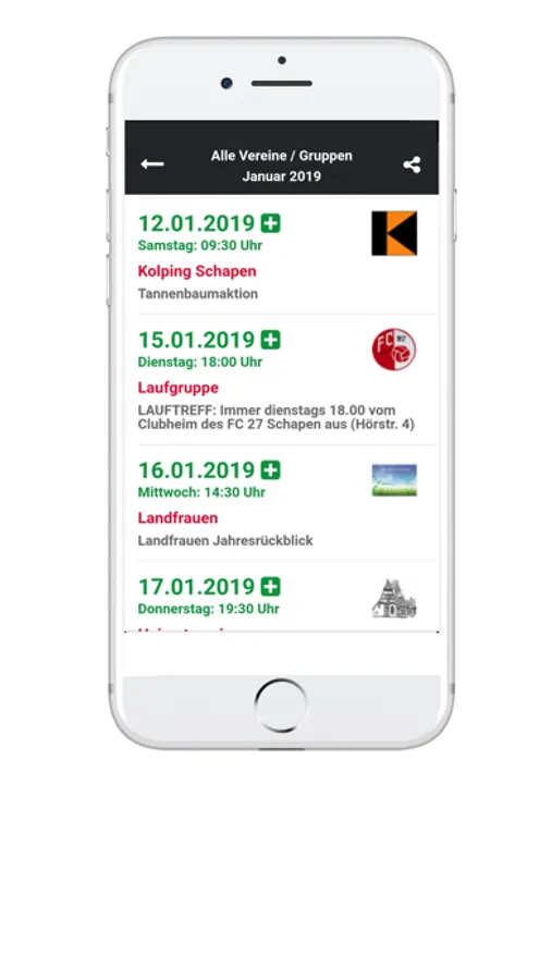 Die Termine können über WhatsApp, Twitter oder Facebook geteilt werden.