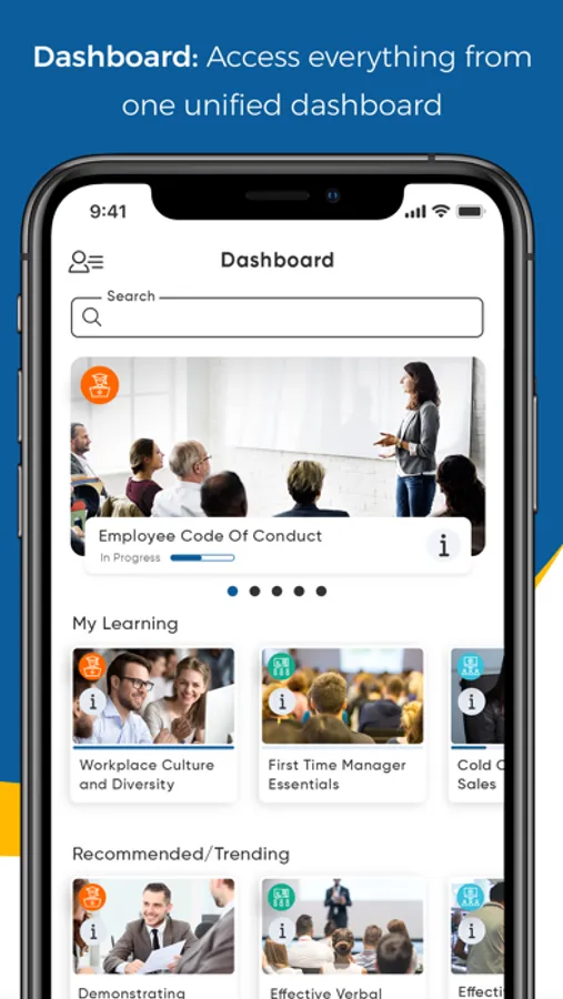 VIEW UPCOMING COURSES: See the assigned upcoming courses and schedule accordingly. VIEW PROGRESS: See course progress anytime ACCESS OFFLINE COURSES: Download courses and access them offline. WIDE RANGE OF CONTENT SUPPORTED: Access SCORM (1.2 and 2004) courses, announcements, messages, videos, documents, and audio files right from the app. VIEW REAL TIME RANKING: Visit the Leaderboard page to check where you stand with respect to your peers. AND MUCH MORE: Change branding colours on the fly, sequence Dashboard widgets and much more. Plenty of customizations available to satisfy everyone’s needs.