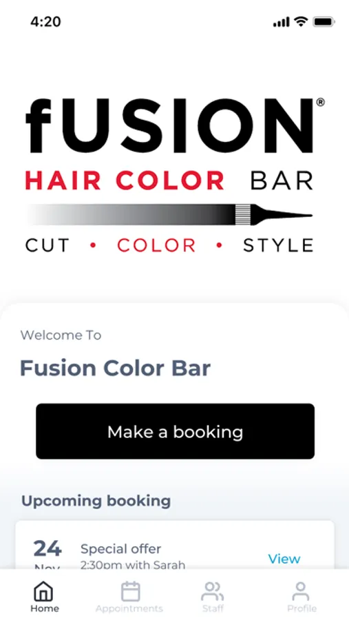 The Fusion Color Bar app makes booking your appointments and managing your loyalty points even easier. You're just a few taps away from feeling good and looking great!
