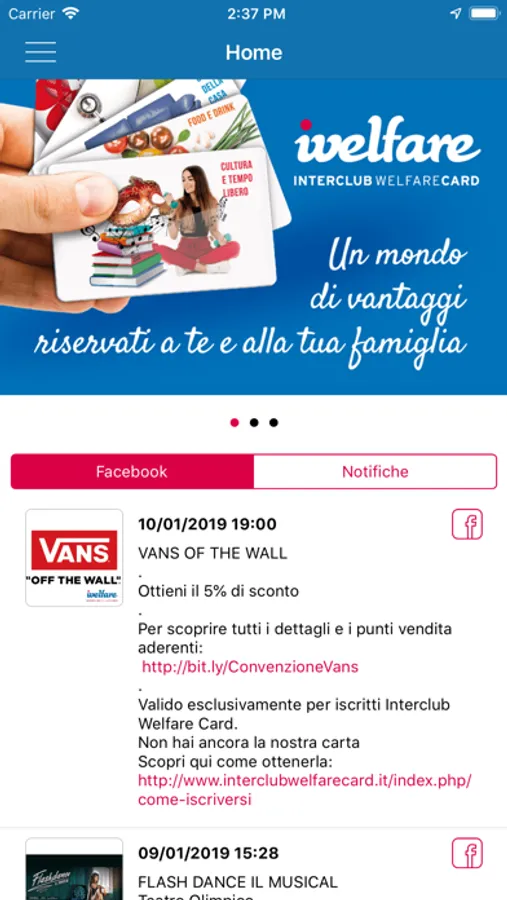 In questa sezione puoi visionare i nostri post facebook con le notizie sugli eventi a tariffa ridotta, per rimanere sempre aggiornato sulle ultime novità. Hai a disposizione anche la sezione Notifiche dove inseriremo informazioni su nuovi coupon disponibili e informazioni last minute.