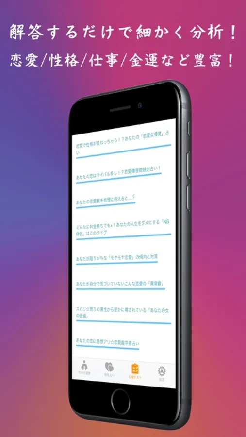 トピックは恋愛、性格・生き方、仕事・金運、美容・健康、総合運・全体運など