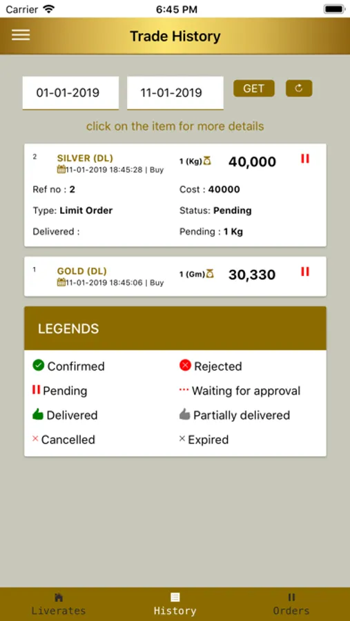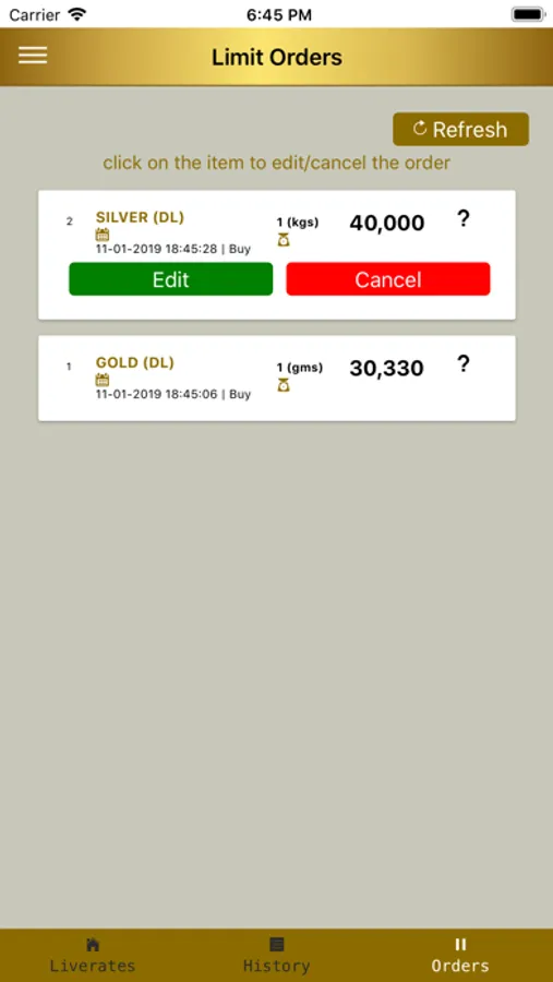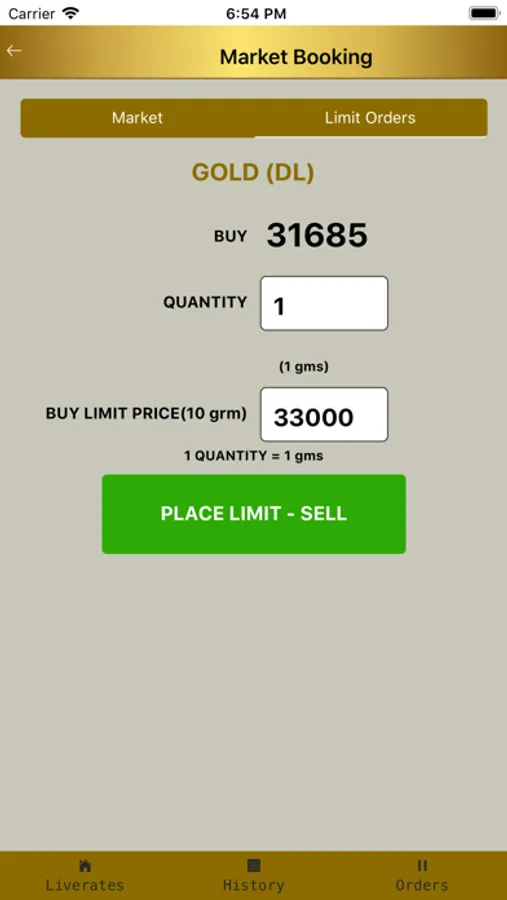 Mangi lal Agarwal Bullion app displays the live price of gold and silver commodities.Through this app user can buy/sell the commodities at market price and limit order price where user can set their price and will be considered when market price matches the user price.The user can buy the commodity by clicking the any of rates under SELL column and sell the commodity by clicking any of the rate under BUY column in liverates page. Also user can view and update their orders.