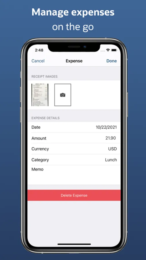 - Expense management – track your expenses using the Expense Log (including receipt capture), then create an Expense Report with just a few taps.