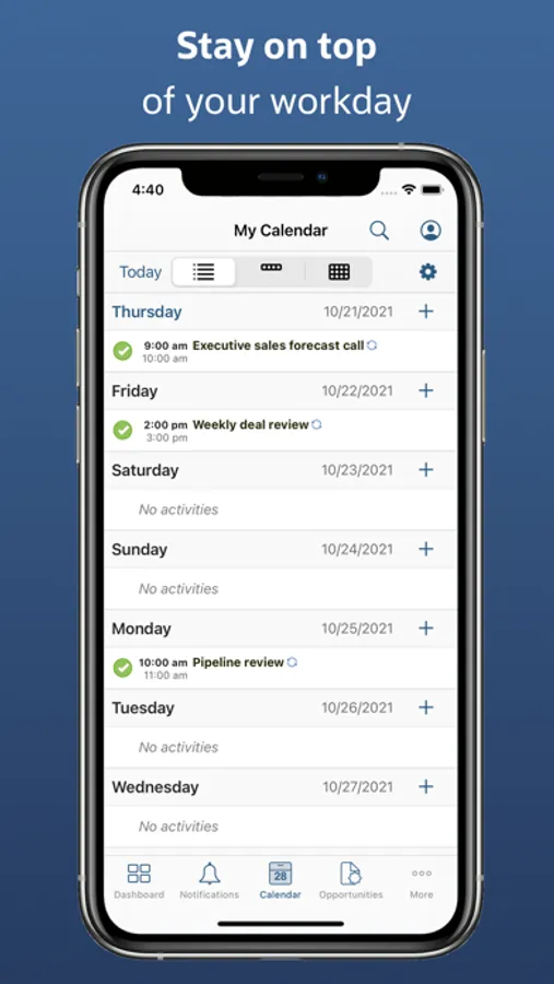 - Complete Activity management – Manage your calendar across list, week and month views. View other calendars including fellow employees.