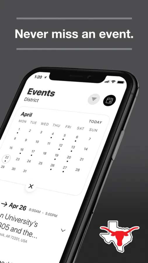 The event section shows a list of events throughout the district. Users can add an event to their calendar to share the event with friends and family with one tap.