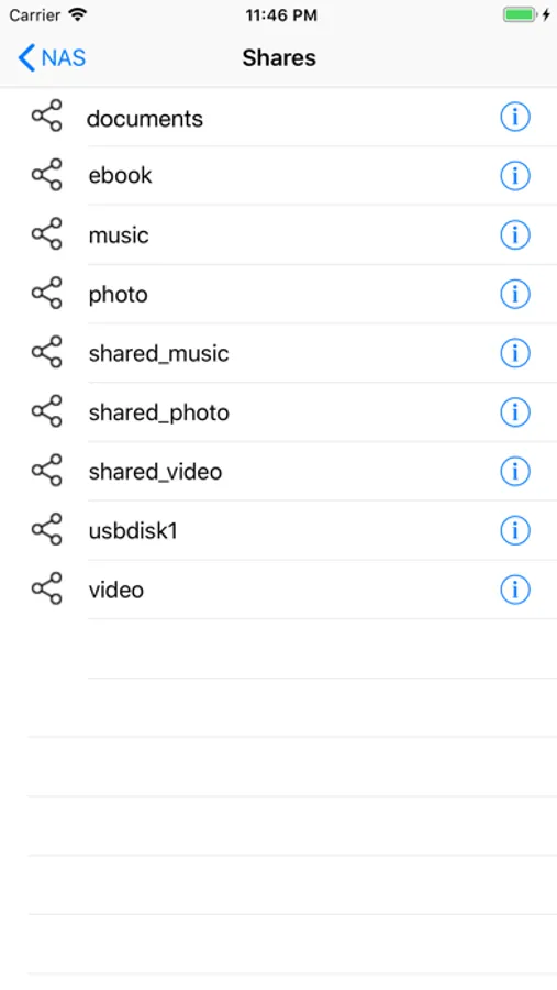 If the shared folder requires the login, tap the 'Info' icon on the right of file share name and enter the user and password.