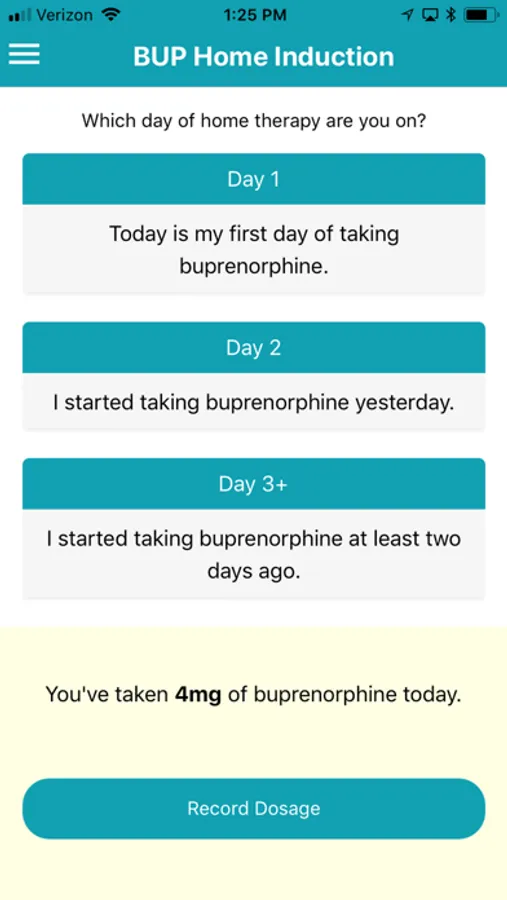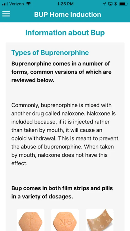 Buprenorphine Home Induction Tool (BUP) is an informative mobile application that guides patients on how to conduct Buprenorphine induction using a series of questions that the patient is asked in the mobile application.