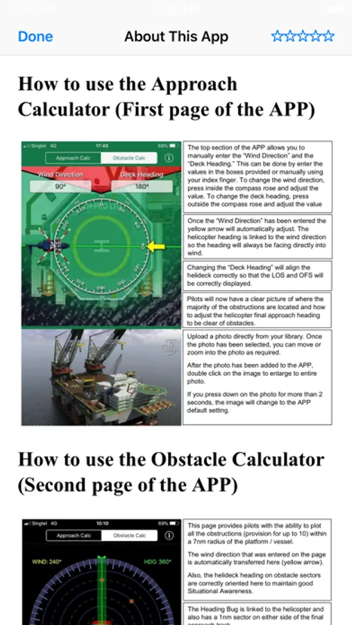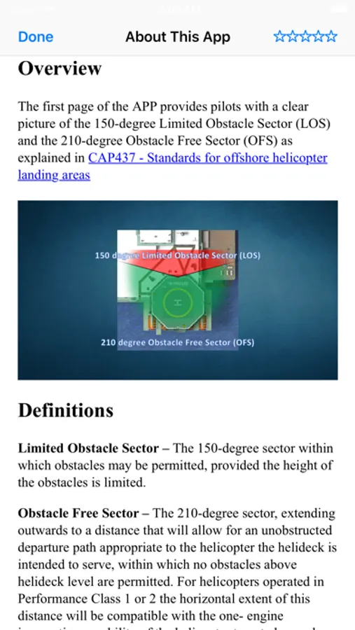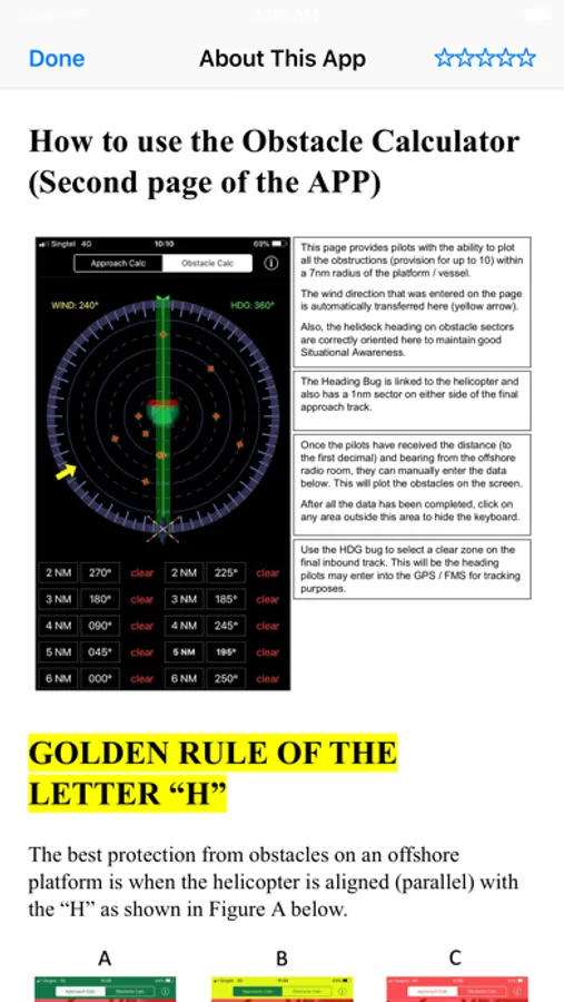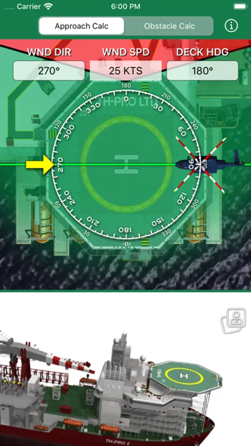 The Offshore Obstacle and Safe Approach Calculator is a situational awareness and planning tool that will assist qualified offshore helicopter pilots in visualizing the helideck layout and the relevant obstacles sectors on any installation or platform.