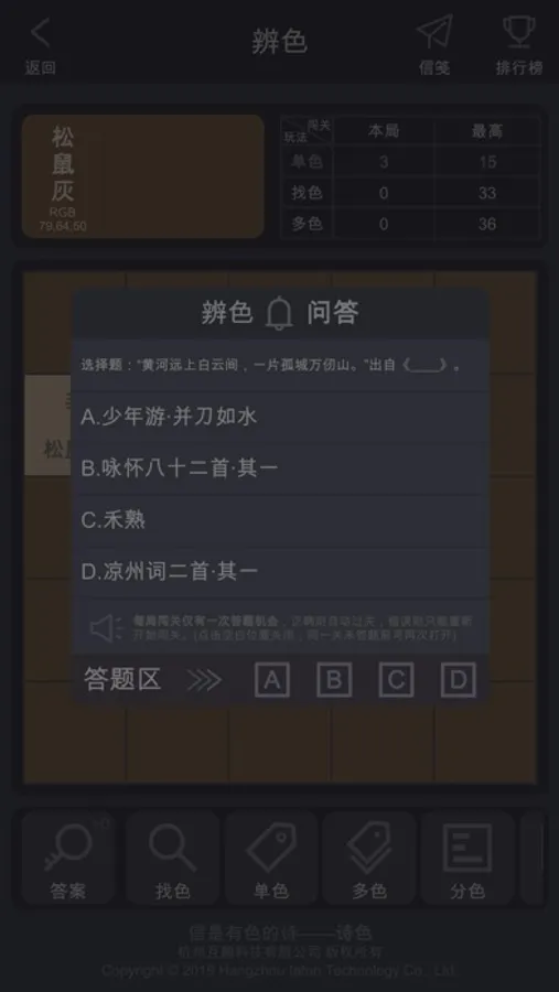 2,【单色】该玩法着重于单一颜色的辨别,并伴随一句诗词的阅读、学习,能够较深层的增强诗词记忆