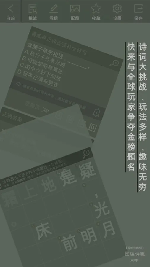 另外,有多种题目范围供选择,并获得不同的题目加分。唐诗宋词必不可少,诗经也是不错的体验,以及更多诗词。