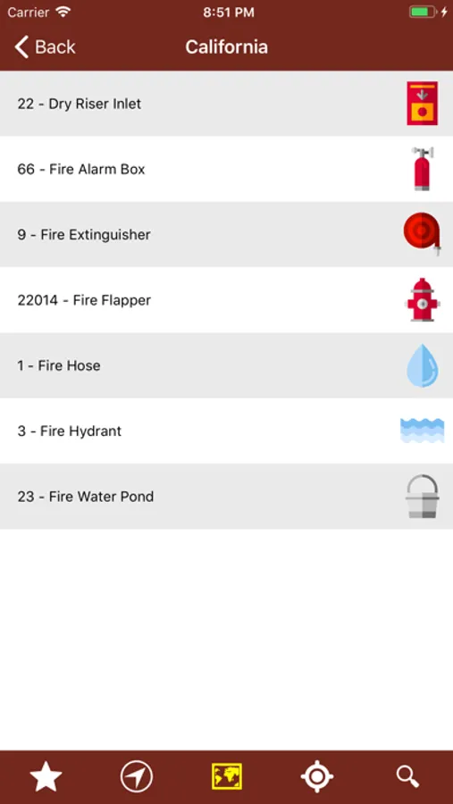 The app provides the following fire emergency facilities and equipments: