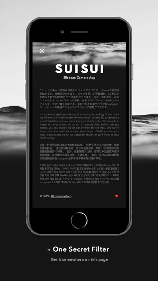 First of all, please tap the button and take a picture. You can shoot pictures with analog texture and unique blur. Also, before taking a picture, you can change the slit pattern from the left menu and switch some color filters with the left and right swipe. Please switch filters according to environment and mood.