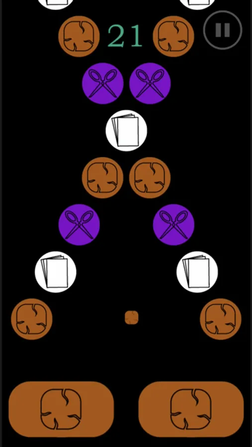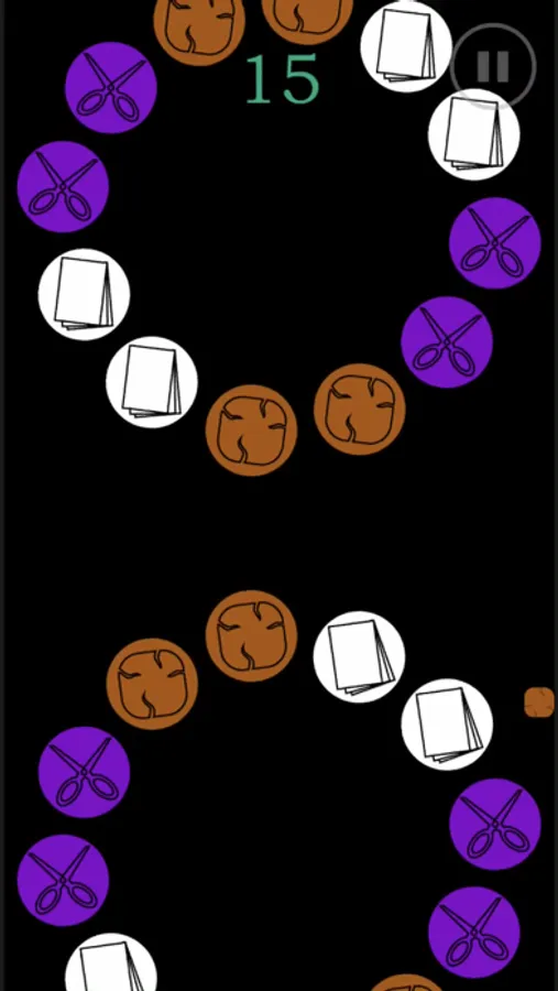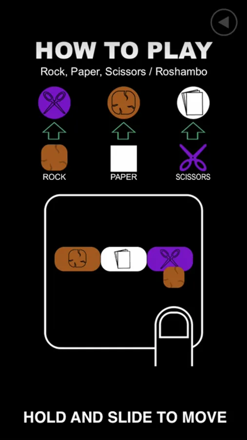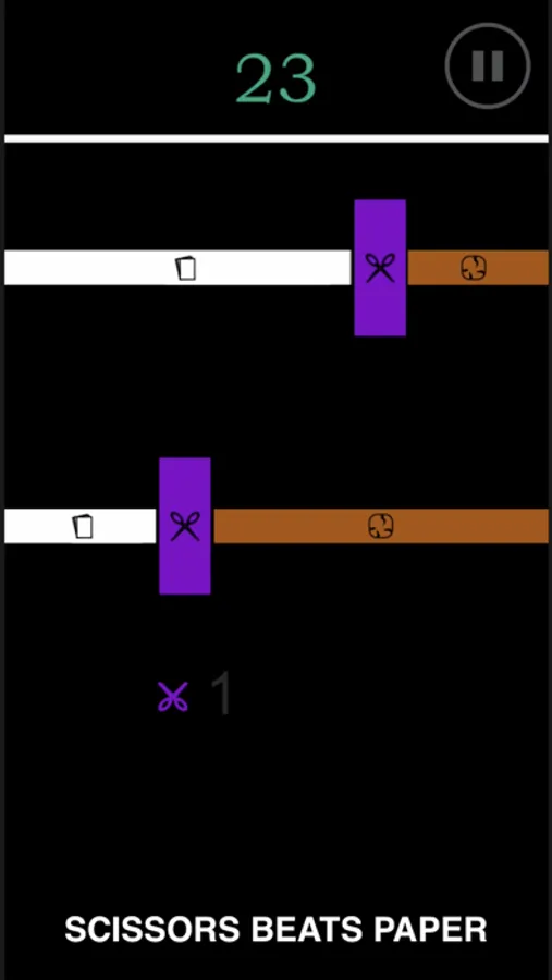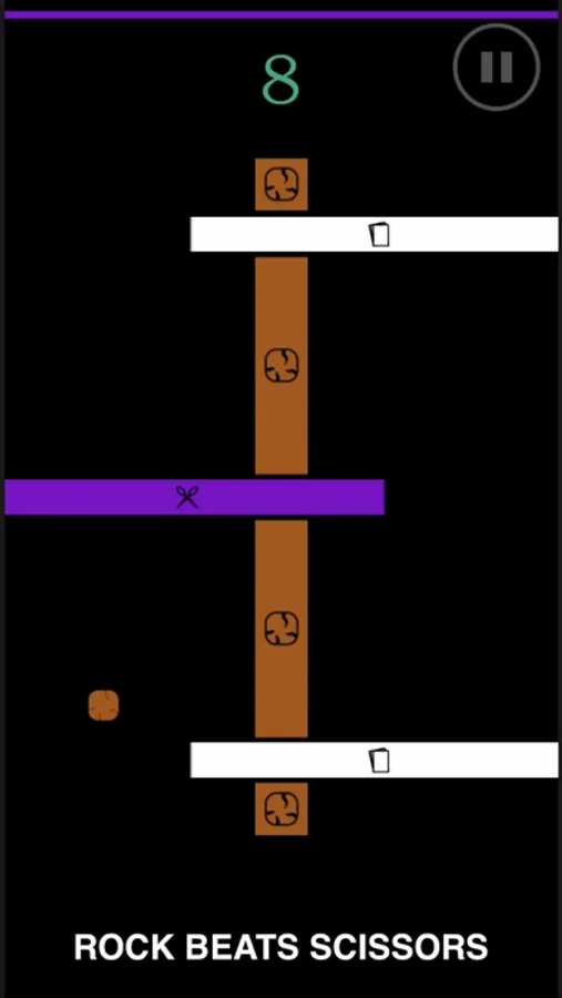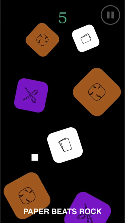 Classic Rock Paper Scissors (rochambeau) twisted into an avoidance game. Your character is either the Rock, the Paper or the Scissors and you need to slide left or right to chose the correct pathway and get through the obstacle.