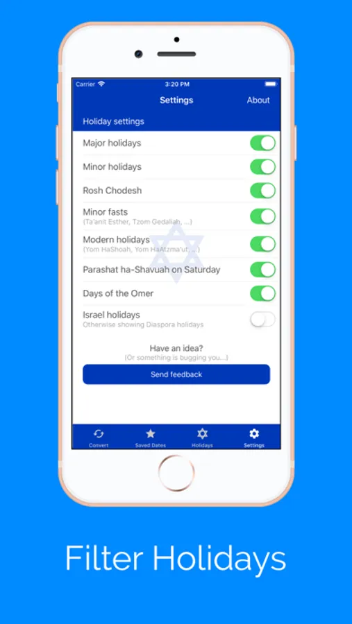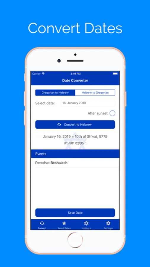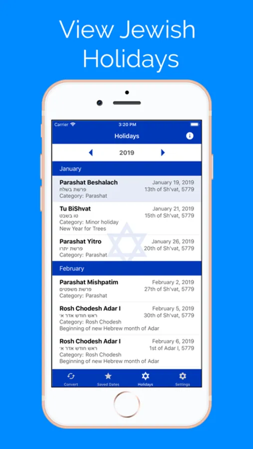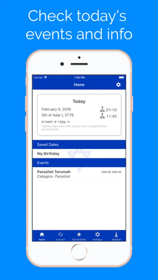 Hebrew Calendar & Dates offers you a beautiful view of the upcoming jewish holidays, date converter and shabbat time tracker.