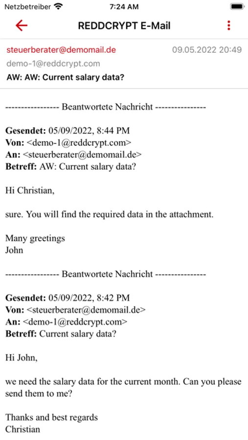 To be able to read the email the recipient authenticates on the REDDCRYPT app, as well. If he already has access and the email has been encrypted with this public key, then the recipient can open, read and answer your mail right away. If he didn’t have access yet, he will have to generate his own key pair to through his email address and a chosen password. Afterwards he can see your encrypted email which can be encrypted by entering the passphrase you have disclosed to the recipient earlier (e.g. via sms or phone call).