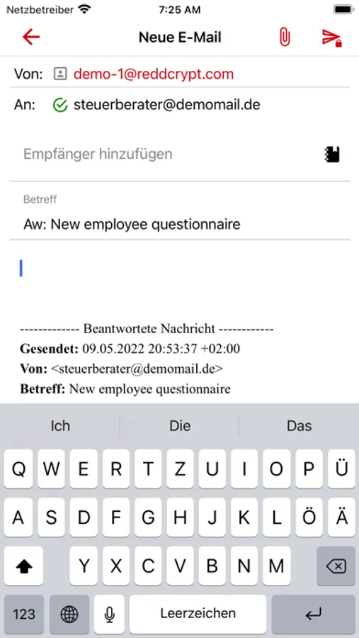 REDDCRYPT automatically encrypts your emails on your device before they are being send. Thus, your emails and their contents remain private. This way you can securely send sensitive information via email.