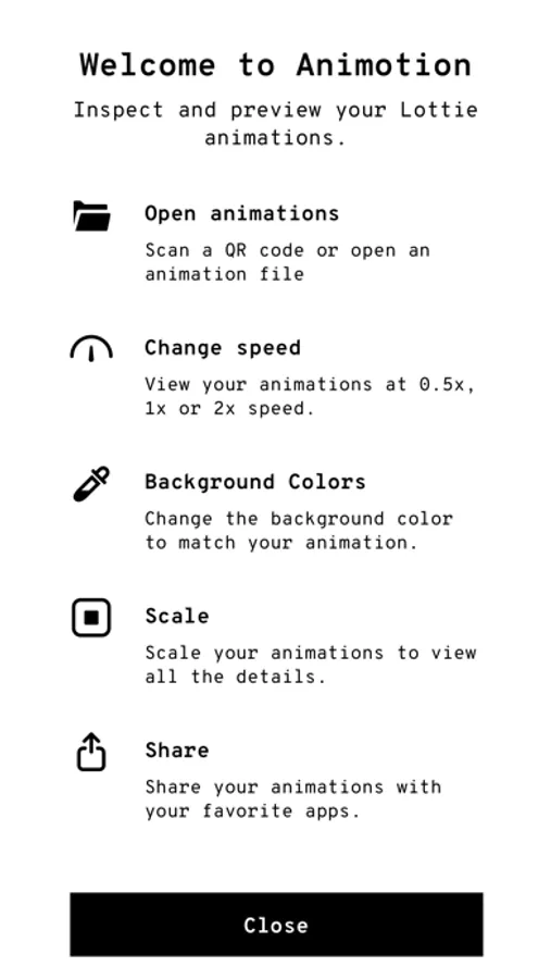 Animotion is an animation inspector. You can preview and inspect your Lottie animations before you implement them into your projects. Open files from your favorite cloud service (iCloud Drive, Google Drive, Dropbox, ...) or scan a QR code from lottiefiles.com to view your animation directly in the app.