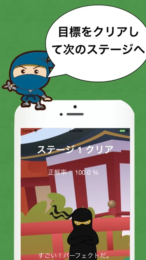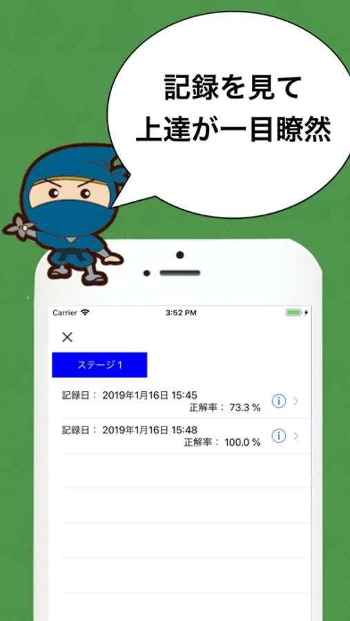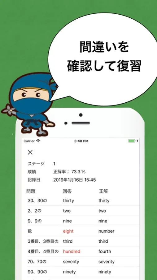 ステージを終了するごとに成績(回答履歴)がアプリに保存されるので、間違った問題と正しい答えを確認して復習することができます。