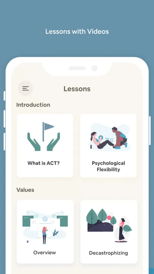 Learn and practice ACT skills using video lessons and fun animations which helps you to remember skills longer. Features over video lessons and easy to read content from some of the leading ACT Practitioners and researchers in the world. You can also take notes on these lessons for future use.