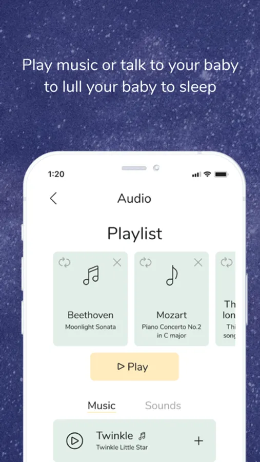 - With white noise and music so your baby can fall asleep and to stimulate his/her development. You can even make a playlist with your favorite sleep sounds!