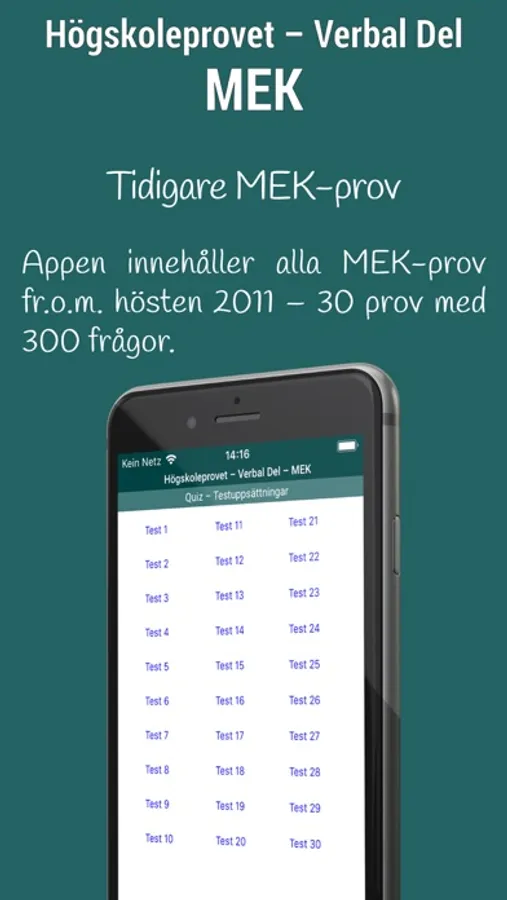 Appen innehåller alla MEK-prov fr.o.m. hösten 2011 – 32 prov med 320 frågor.