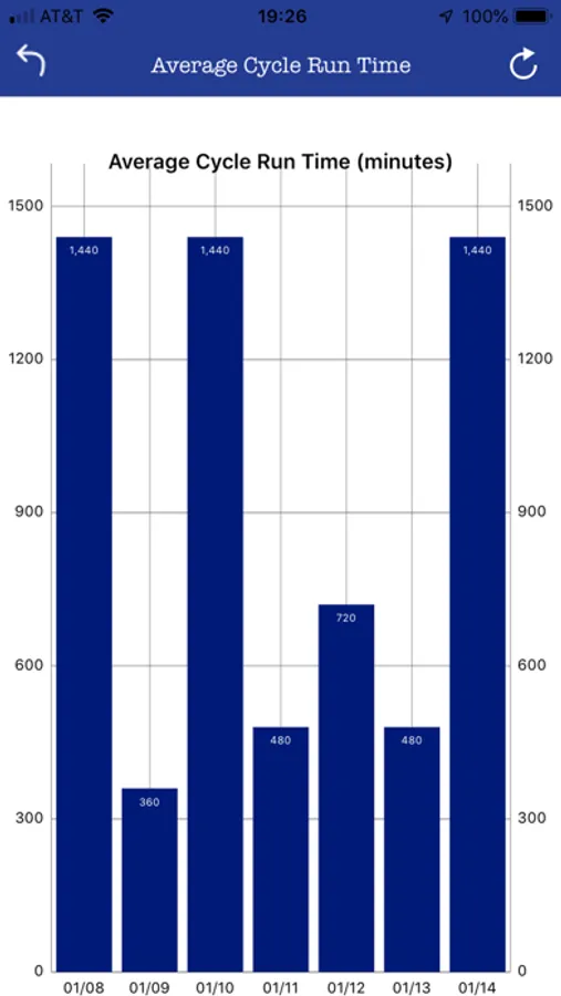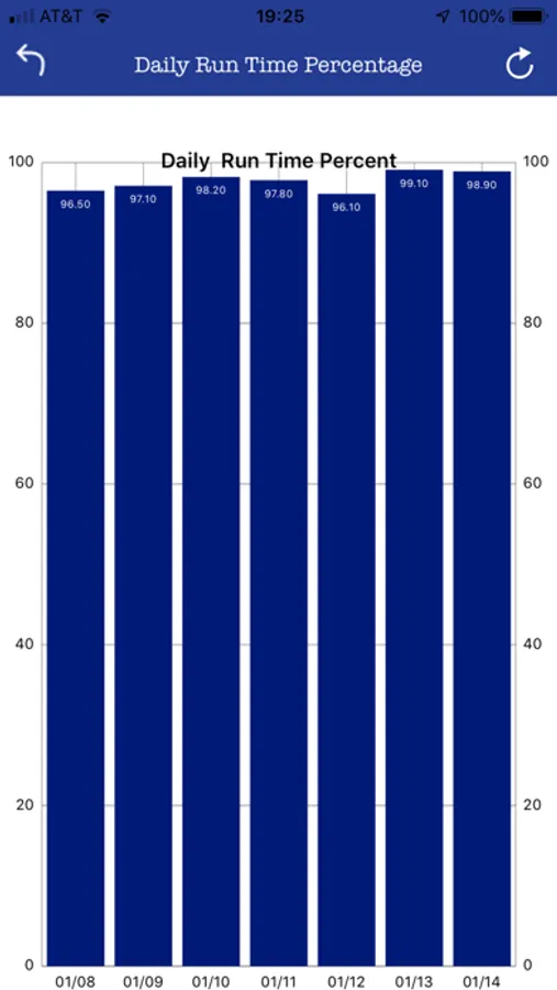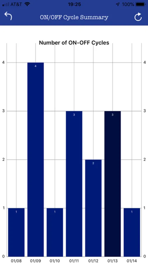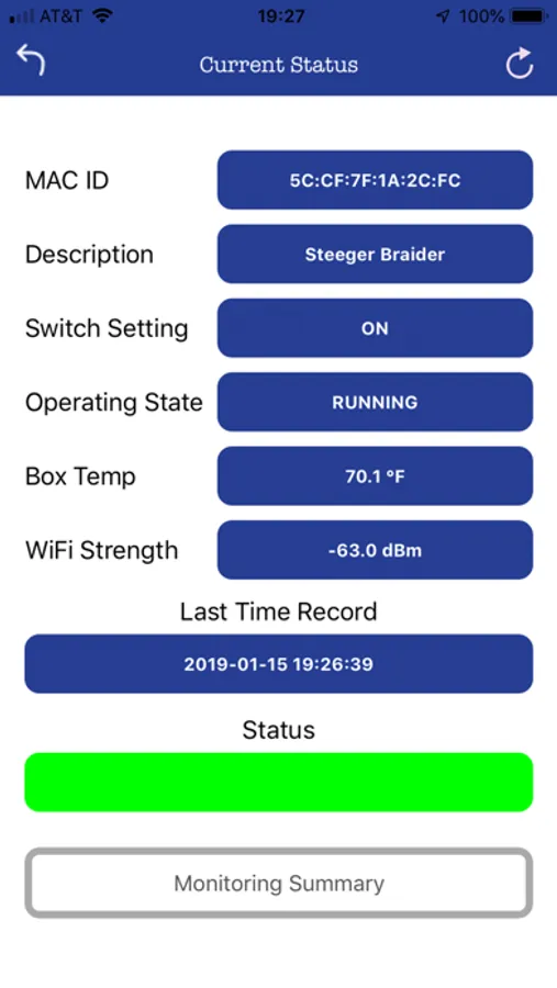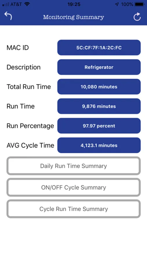 The application provides the Current State of the device including Hardware ID, ON/OFF state, and last time record. The application also provides a Monitoring Summary for the previous seven days including Daily Run time, ON/OFF Cycle Summary, and a Cycle Run Time Summary