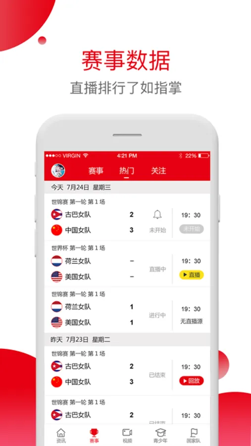 比赛直播:多种手球赛事比赛及在线直播,数据直播,让广大用户可以一边观看赛事一边与其他球迷共同分享心情。