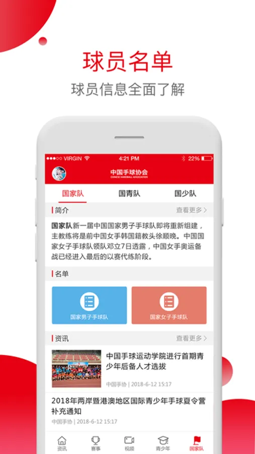 国家队:介绍国家队、国青队、国少队的简介,训练、竞赛、新闻等资讯及历年参赛人员名单。
