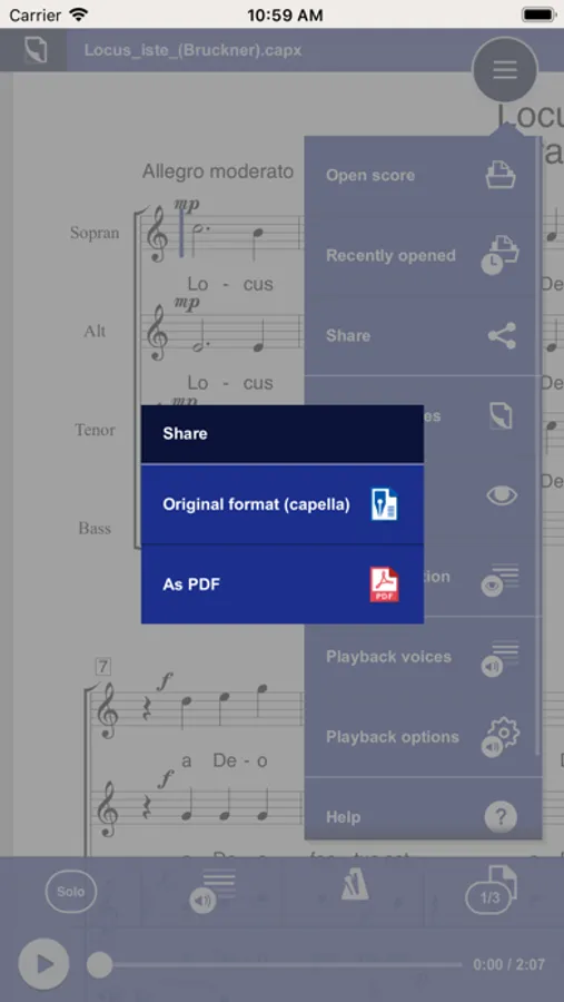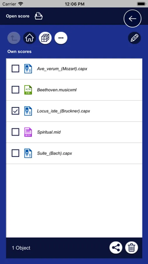 Receive scores from other musicians, for example via WhatsApp or eMail. Share your scores with other musicians as capella file or PDF.